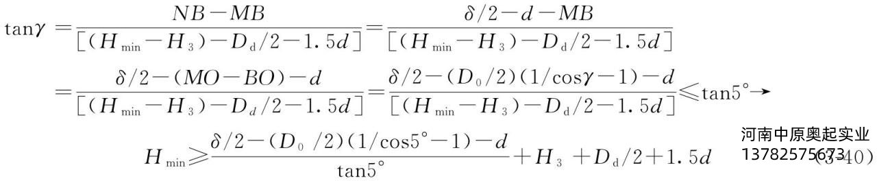 按式(3-40)和式(3-41)计算出Hmin值,求出H0值。吊钩在*底端状态下,钢丝绳从卷筒绕出点到吊钩组*外缘动滑轮水平线上绳槽的绕入点的空间距离(图3-55)。